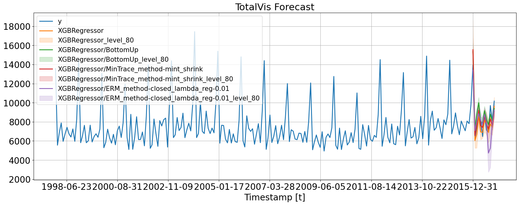 We find that XGB with MinTrace(mint_shrink) reconciliation result in the