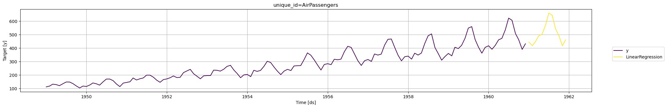 Compute the forecast for the next 12 months| unique_id | ds | LinearRegression | |