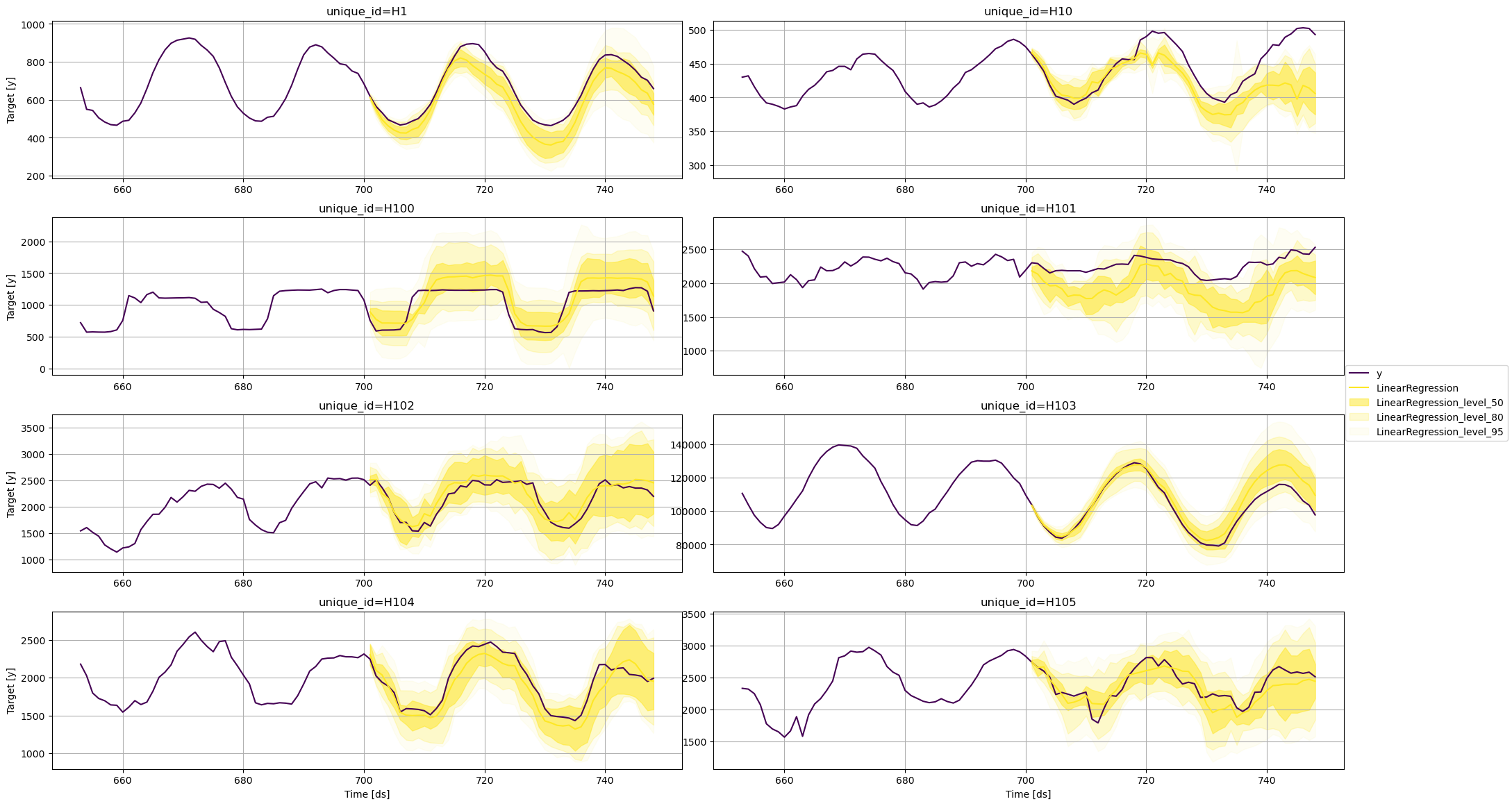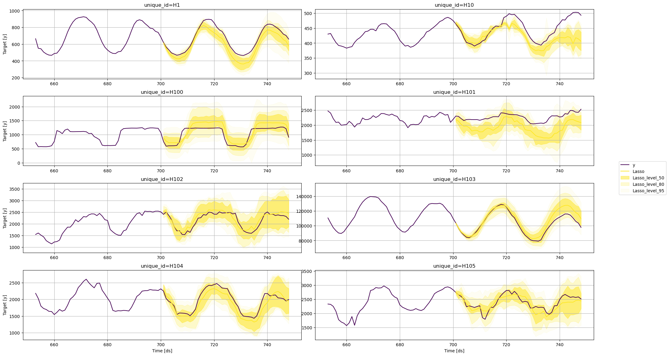 horizon: An integer that represent the forecasting horizon. In this case, we’ll forecast the next 48 hours.level: A list of floats with the confidence levels of the prediction intervals. For example,level=[95]means that the range of values should include the actual future value with probability 95%.