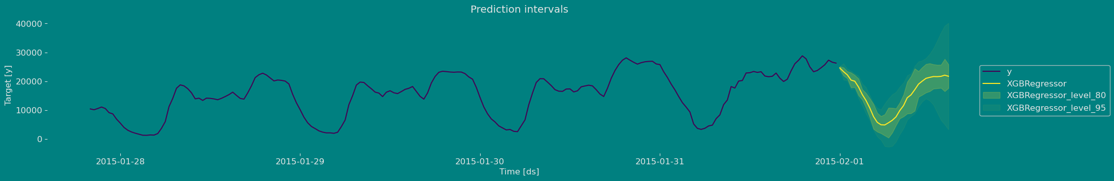 To generate forecasts use the predict method.| unique_id | ds | XGBRegressor | XGBRegressor-lo-95 | XGBRegressor-lo-80 | XGBRegressor-hi-80 | XGBRegressor-hi-95 | |