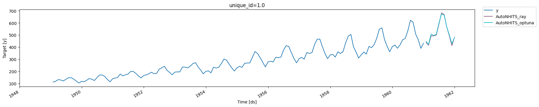 h: forecasting horizon.loss: training and validation loss fromneuralforecast.losses.pytorch.config: hyperparameter search space. IfNone, theAutoclass will use a pre-defined suggested hyperparameter space.search_alg: search algorithm (fromoptuna.samplers), default is TPESampler (Tree-structured Parzen Estimator). Refer to https://optuna.readthedocs.io/en/stable/reference/samplers/index.html for more information on the different search algorithm options.backend: backend to use, default isray. Ifoptuna, theAutoclass will use theOptunabackend.num_samples: number of configurations explored.