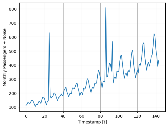 For this example we will use the classic Box-Cox AirPassengers dataset that we will augment it by introducing outliers. In particular, we will focus on introducing outliers to the target variable altering it to deviate from its original observation by a specified factor, such as 2-to-4 times the standard deviation.