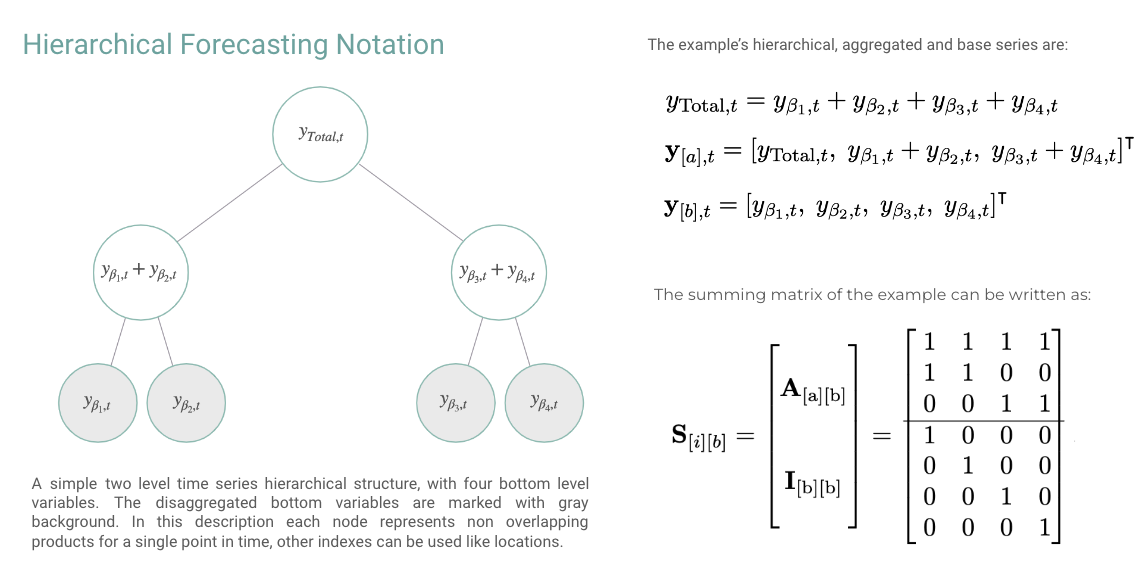 In this example we will use HINT for the hierarchical forecast task, a multivariate regression problem with aggregation constraints. The aggregation constraints can be compactcly represented by the summing matrix , the Figure belows shows an example. In this example we will make coherent predictions for the TourismL dataset. Outline1. Import packages