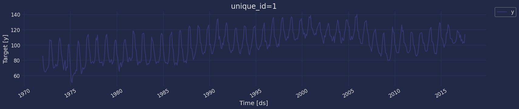 Plot a series using the plot method from the StatsForecast class. This method prints a random series from the dataset and is useful for basic EDA.