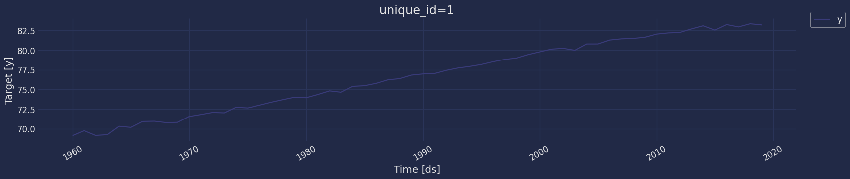 Plot some series using the plot method from the StatsForecast class. This method prints a random series from the dataset and is useful for basic EDA.