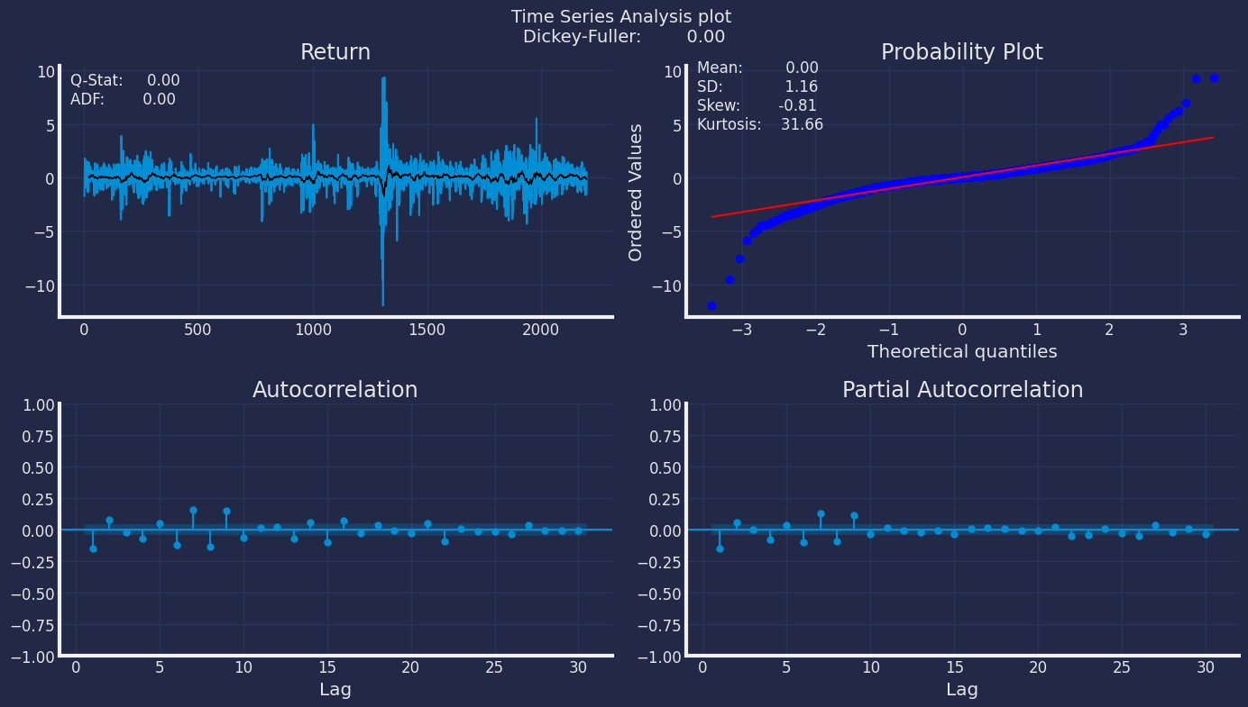 - Model (1) reflects the fat tails and volatility clustering.