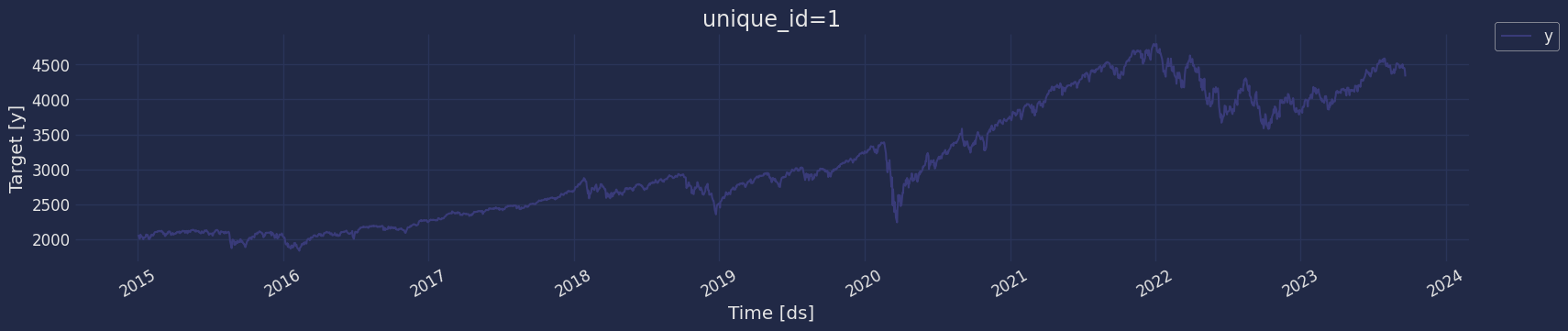 Plot a series using the plot method from the StatsForecast class. This method prints a random series from the dataset and is useful for basic EDA.