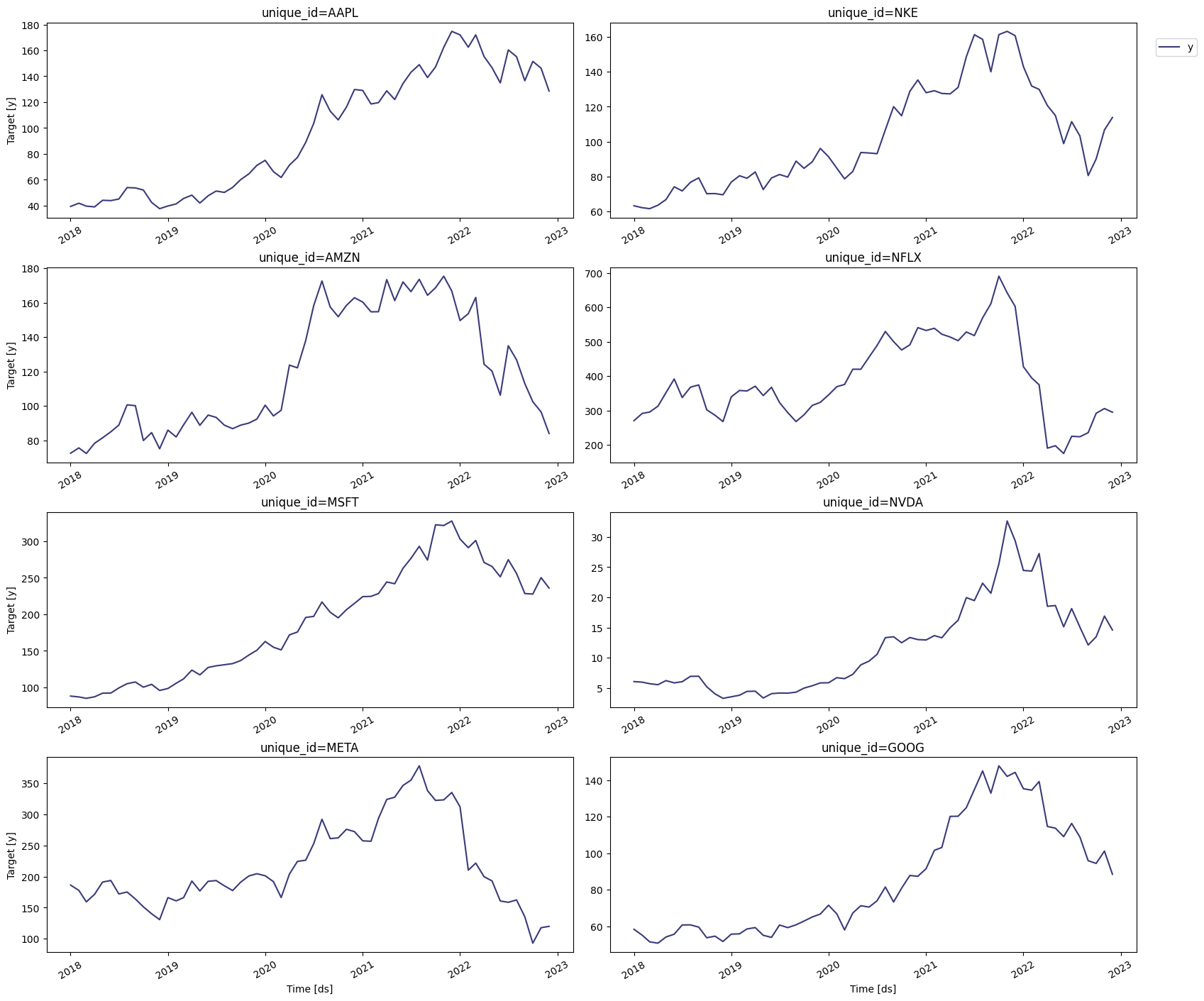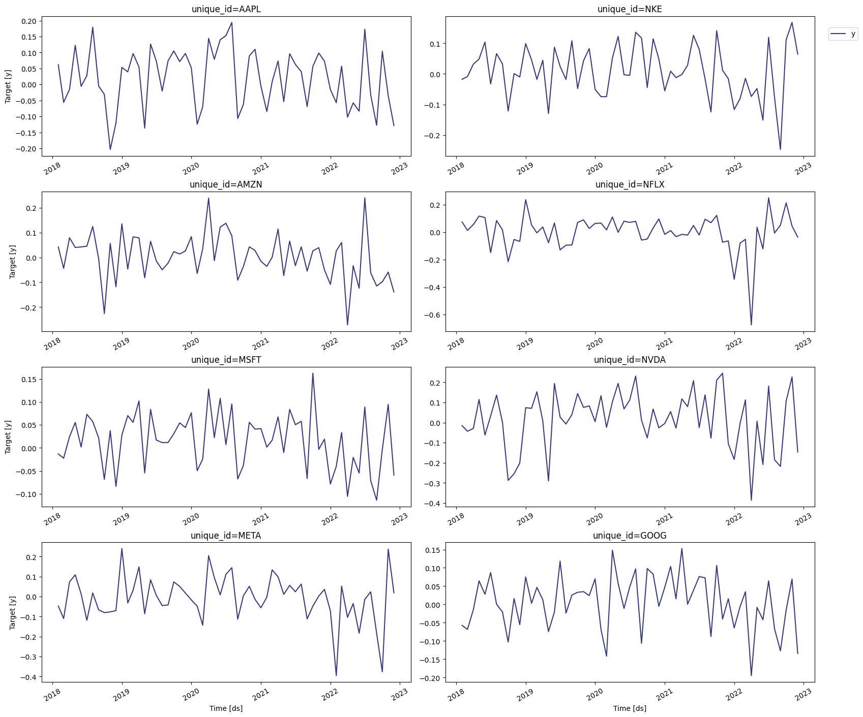df: The dataframe with the training data.models: The list of models defined in the previous step.freq: A string indicating the frequency of the data. Here we’ll use MS, which correspond to the start of the month. You can see the list of panda’s available frequencies here.n_jobs: An integer that indicates the number of jobs used in parallel processing. Use -1 to select all cores.